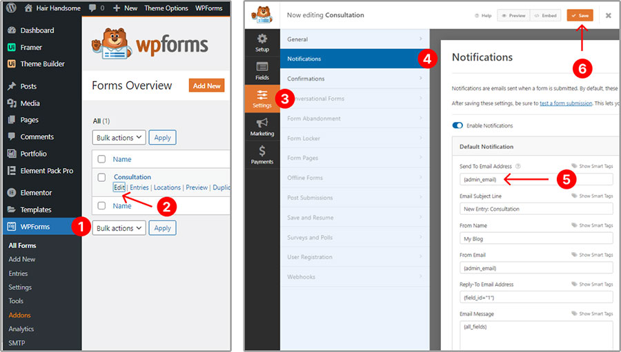 To modify the contact form email settings, please navigate to WPForms -> Edit Form -> Settings -> Notifications -> Send To Email Address then add the email address where you want to recevie all submission data, you can contact us if you have any confusion.